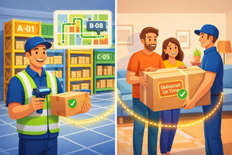 В сценарии А вероятность ошибки (пересорта) — около 3%. В сценарии Б — 0,1%. Почему? Потому что система не дает взять не тот товар. Если в ячейке D-07-2 лежат серые кресла, а сборщик по ошибке взял синие, сканер запищит: «Ошибка! Штрихкод не соответствует заказу».